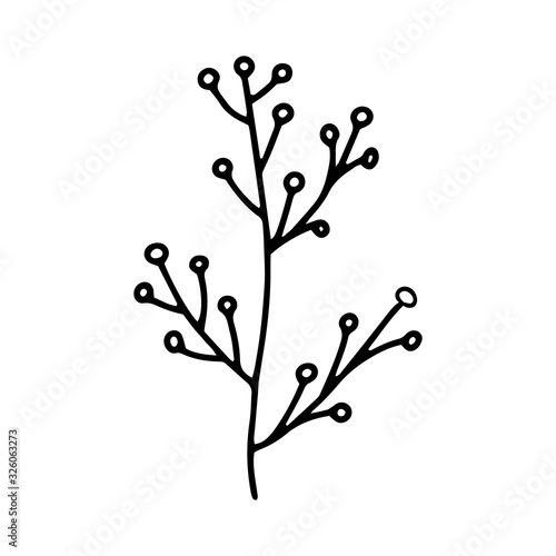 Branch with Doodle berries illustration.Black and white outline image. Botanical Doodle.A simple drawing of a line.Vector