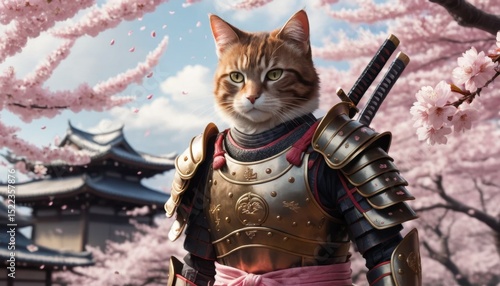 Brave Tabby Cat Samurai in Cherry Blossom Spring Japan