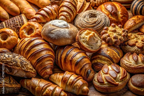 Bread and Bakery Items: A high-resolution image featuring freshly baked bread, pastries, croissants, or other bakery delights, showcasing their golden crusts and fluffy interiors.