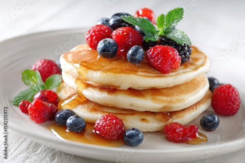 Breakfast of pancakes topped with berries and maple syrup against a pale backdrop