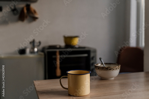 appliance, bowl, breakfast, hot drink, cook, cookware, bricolage, food, fruit, furniture, home, indoor, kitchen, kitchen utensile, pot, real, rustic, still life, table