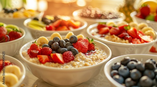 breakfast scene featuring several bowls of oatmeal topped with vibrant fruits