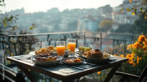 breakfast, table, food, orange, juice, fruit, drink, plate, glasses, dining, meal, morning, sunlight, balcony, view, city landscape, building, portuguese, europa, travel, vacation, lifestyle, delicious, healthy, appetising, fresh, epicure, tasty, eating, enjoyment, cosy, relaxing, urban, architecture, outside, natural, bright, yellow, green, brown, light, daytime