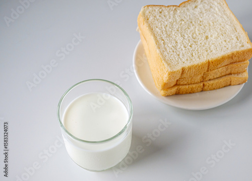 breakfast,Fresh milk in a glass and White sliced bread stacked on the white wooden table