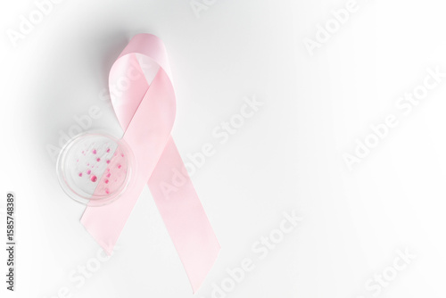 Breast cancer research concept, glass petri dish and pink awareness ribbon isolated on white background. Banner