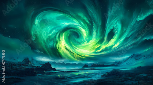 Breathtaking abstract image depicting a mesmerizing cosmic vortex of vibrant glowing aurora borealis lights swirling amidst a surreal. Electric Aurora Vortex. Illustration