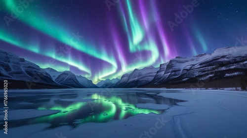 Breathtaking aurora borealis dances above snowy mountains and frozen lake scene