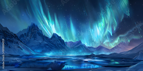 aurora, borealis, landscape, mountain, snow, sky, night, star, water, ice, cold, blue, green, scenic, nature, winter, serene, aethereal, light, cosmic, bright, dark, beautiful, illustration, artwork, environment, celestial, wilderness, arctic, tranquil, pristine, glacé, dramatic, fantasy, scenery, glow, vibrant, illuminated, magical, space, peak, horizon, calm, peace, wonder, meteor, vale