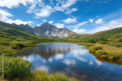 breathtaking, mountain, landscape, serene, lake, under, clear, blue, sky, majestic, peak, reflect, tranquil, water, surface, creating, picturesque, scene, exploration, adventure, lush, greenery, wildflower, adding, vibrant, colours, scenery, sunlight, entire, warm, glow, beauty, nature, masterpiece, idylli, setting, harmony, between