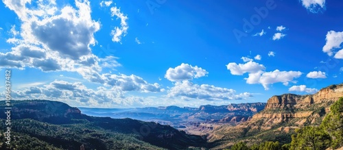Breathtaking panoramic view of mountainous ranges under a vibrant blue sky with fluffy clouds in a scenic natural landscape