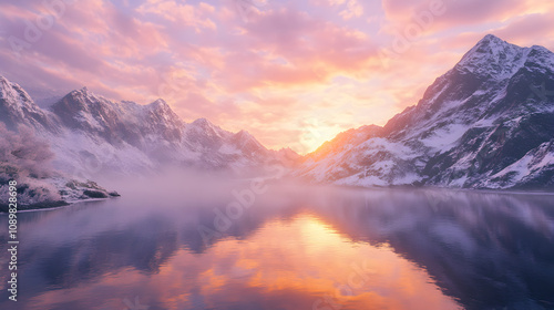 Breathtaking Sunrise Over Foggy Alpine Lake Surrounded by Snowy Mountains and Vibrant Pastel Sky