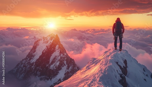 breathtaking view of mountain peak at sunset, showcasing climber standing on snowy summit, surrounded by clouds and vibrant colors in sky. scene evokes sense of adventure and tranquility