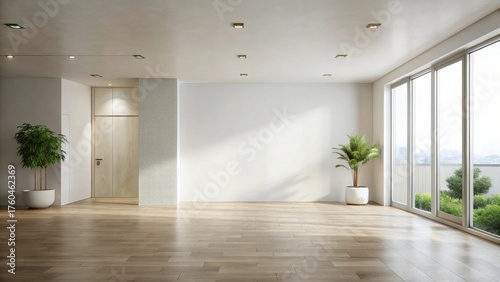 Bright, airy, minimalist apartment interior design with hardwood floors, large windows, and potted plants showcasing a clean, modern aesthetic