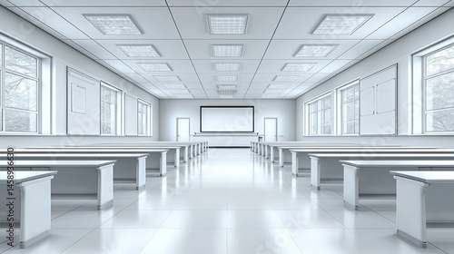 classroom, empty, white, interior, education, school, desk, learning, projector, clean, bright, architecture, minimalist, modern, study, space, nobody, light, indoor, table, row, student, university, college, design, presentation, office, lecture, training, conference, workspace, room, corporate, business, meeting, work, blank, screen, whiteboard, furniture, seminar, teaching, class, perspective, academic, style