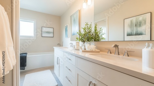 washroom, bright, airy, large, modern, clean, minimalist, design, decor, interior, bathtub, sink, mirror, natural, lighting, greenery, relaxation, contemporary, fresh, roomy, elegance, style, comfort, home, aesthetic, serene, towel, toiletry, relaxing, soothing, warm, invitation, ambience, beauty, lush, tranquil, fixture, layout, sophistication, organisation, furniture, renovation, detail