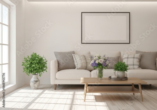 sofa, cushion, coffee table, potted plants, flower, picture frame, window, wooden floor, sunlight, vase, tray, wall, modern, minimalist, bright, light, clean, cosy, comfortable, serene, inviting, contemporary, elegant, stylish, tranquil, airy, neutral, living room, home interior, residential, indoor, daylight, apartment, interior, room, background, living, empty, fantasy, computer graphic, conceptual