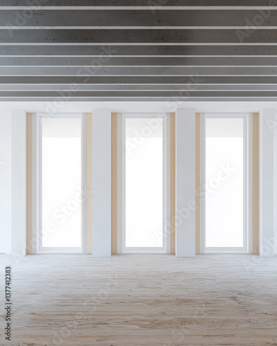 Bright and spacious interior with large windows and wooden flooring in modern design