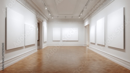 Bright art gallery exhibition space featuring blank canvases, modern interior design and parquet wood flooring