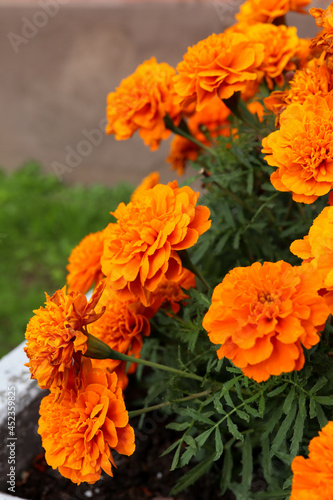bright beautiful orange marigold flower in flower pot close up view outdoor