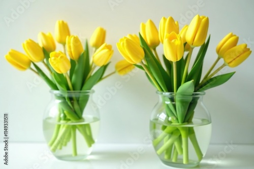 Bright bouquet of yellow tulips in a glass vase, arrangement, vases