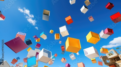 bright, box, flying, illustration, colourful, cardboard, sky, blue, air, dynamic, playful, scene, group, different, size, shape, vibrant, floating, cheerful, whimsical, motion, soaring, high, fun, lively, energetic, high-coloured, uplifting, joyful, picturesque, imaginative