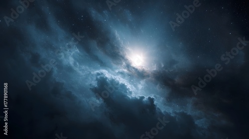 Bright celestial light shines through cosmic clouds and stars in the deep expanse of space