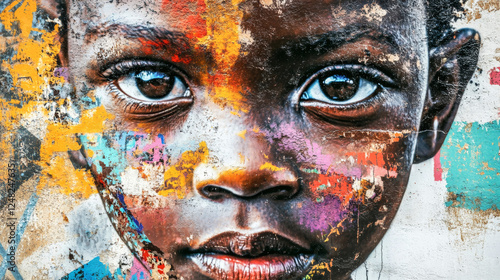african, children, graffiti, wallpainting, urban, art, vibrant, colours, expressive, face, street, photorealistic, expression, colourful, portrait, collage, element, realism, hope, resilience, wide, angle, creative, cultural, representation, style, character, youth, city landscape, visual, storytelling, bright, hue, found, object, bold, design, emotion, neighbourhood