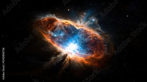 Bright colors radiate from a cosmic explosion, showcasing blues, oranges, and reds amidst the dark backdrop of space. This celestial event reveals the beauty of stellar formation