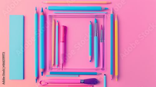 Bright drawing tools arranged in a square on a pastel pink backdrop.