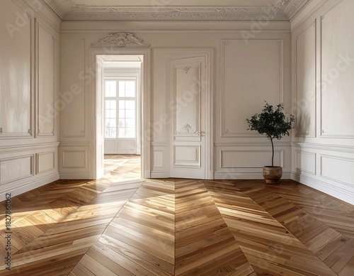 interior, room, empty, herringbone, wood, floor, parquet, white, wall, molding, decorative, doorway, window, light, bright, sun, sunlight, plant, pot, tree, elegant, classic, style, home, residence, architecture, design, indoor, roomy, clean, luxury