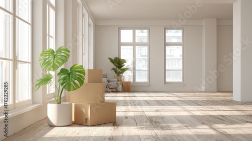 empty, room, moving, box, real, estate, interior, design, home, house, plant, plant, monstera, window, light, bright, white, space, floor, wood, wooden, flooring, architecture, apartment, residence, relocation, lifestyle, modern, contemporary, indoor, nobody, new, beginning, growth, sunlight, clean, minimalistic, simple, neutral, staging, template