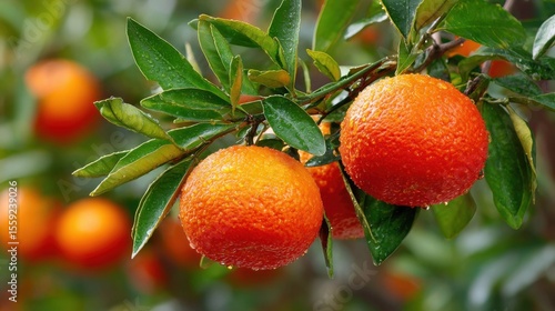 Bright, freshly ripened citrus fruits cluster on a tree branch, with droplets of water glistening on their textured skin.