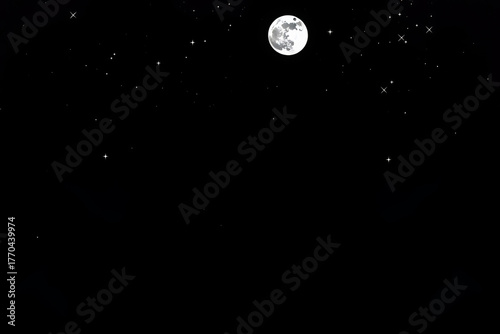 Bright full moon glowing in a dark night sky surrounded by sparkling stars, symbolizing tranquility, dreams, and cosmic beauty, perfect for nature, astronomy, and night-themed creative projects.