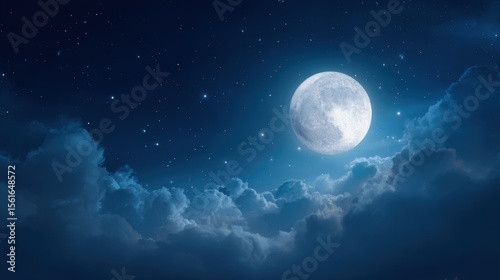 Bright full moon illuminating dark starry night sky with clouds and stars.