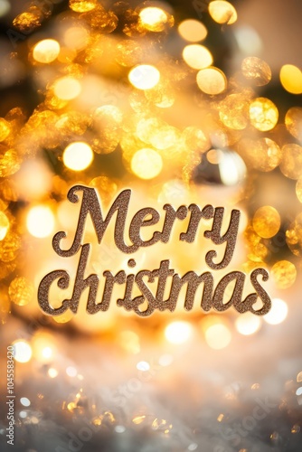 Bright golden lettering "Merry Christmas" on a golden bokeh background, vertical