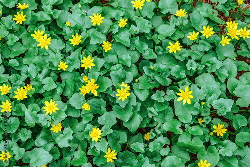 Bright green floral texture of leaves and yellow flowers of Ficaria verna. Beautiful natural background with a harbinger of spring - fig buttercup