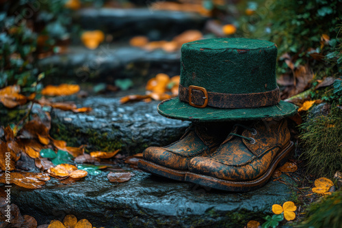 Bright green leprechaun hat lays beside a pair of worn shoes on a rugged stone pathway. Surrounding foliage features vibrant autumn leaves, creating a whimsical outdoor atmosphere.