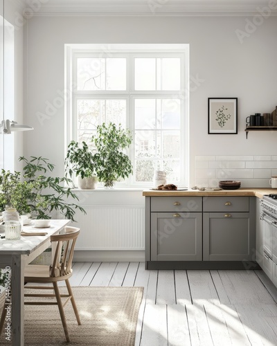 Bright kitchen scene with wooden table plants window frame gray cabinet wood flooring and natural light
