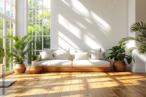 interior, luxury, house, room, living, wall, empty, modern, classic, inside, carpet, three-dimensional, decoration, sunlight, window, scene, rendering, light, panel, space, frame, table, board, chair, background, style, bright, design, illustration, white, architecture, furniture, floor, apartment, sofa, plant, lamp, render, contemporary, daylight, studio, brown, elegant, green, growing, pot, flower