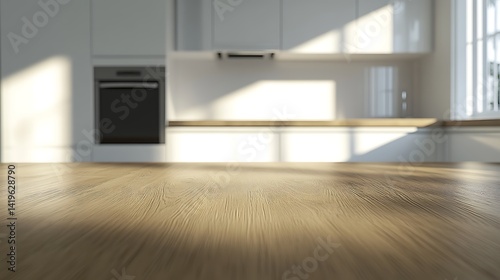 Bright modern kitchen interior showcasing a wooden table with sunlight streaming through windows