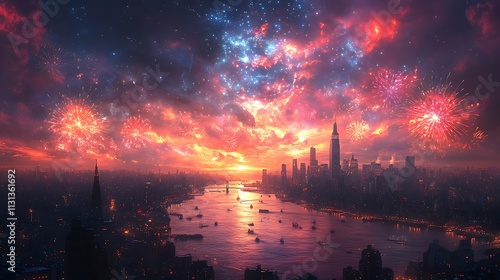 bright, new, year, ball, descending, city, skyline, surrounded, high-coloured, fireworks