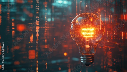 Bright Orange Light Bulb Illuminating Digital Background with Binary Codes and Abstract Data Streams Representing Technology and Innovation Concepts