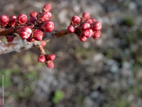 Bright pink unopened bursting flower buds of an apricot tree on branches. Close-up, narrow focus, blurred background.