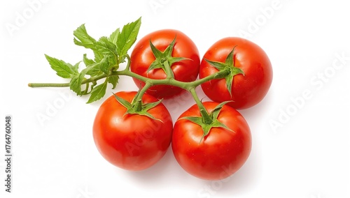 Bright red tomatoes on a clean white backdrop with green leaves and natural colors