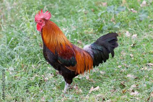 cock, animal, nobody, rooster, chicken, bird, male, domestic, poultry, view, farm, cockerel, feather, tail, farm animal, outdoors, side, colours, red, grass, image, fowl, agriculture, 1, nature, green, rural, caged, food, photo, closeup, beak, standing, ranch, day, field, beautiful, hen, fauna, singing, crest, full, free, horizontal, background, summer