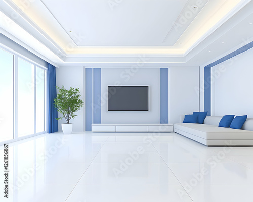 Bright, spacious living room interior with TV, sofa, plant, and window view. Generative AI