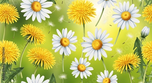 Bright Spring Meadow with Blooming Daisies and Dandelions Under a Soft Green Background