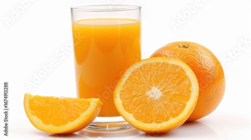 Bright Summer Beverage Close-Up: Fresh Orange Juice in Cup with White Background & Organic Oranges