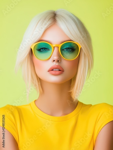 model, fashion, summer, blond, sunglasses, yellow, green, beauty, portrait, style, confidence, colours, casual attire, wear, trendy, accessory, hair, make-up, lively, modern, bold, striking, cheerful, youthful, expression, playful, posing, appearance, bright, fun, chic, youth, unique, female, sunny, confident, look, colourful, lifestyle, vibe