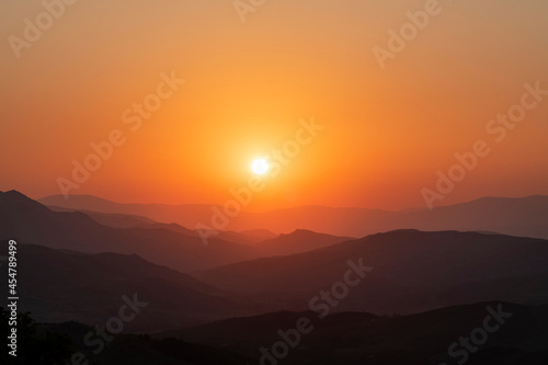 Bright summer sunset over the mountais silhouette.